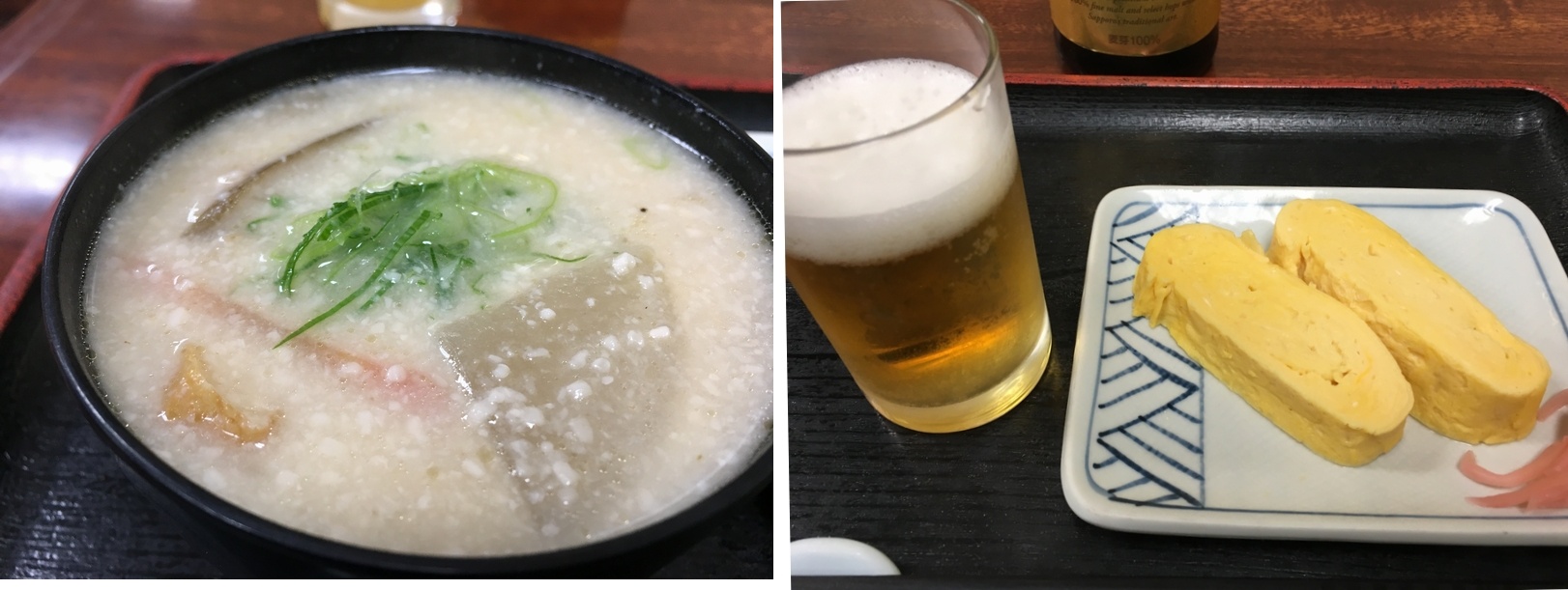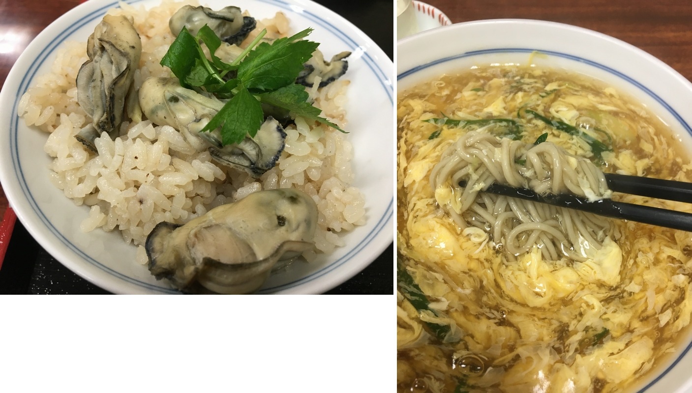 翌朝は食さずに、11時の開店を待って街の食堂、<わたつね>さんへ。 粕汁、の短冊を目にしたとたん、もう今日はいいや、という気持ちになりビールを注文。 ひと切れ120円の出汁巻きで完全本気モード。 掟破りのけいらんの蕎麦と牡蠣ご飯をつまみにまた呑んでしまった、しかも異国の朝から。