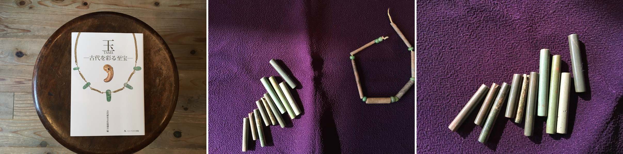 新しい発見は、 @ 骨董の市場などで、時々短い管玉が長い通常の管玉に混じって出てきます。 両端を研磨してあるのですが、てっきりそれは半分に折れた管玉を、業者が自分で磨いて作った「半作品」なのかと思っていました。 しかし今回、ちゃんと両端磨かれたものが出土してましたから、当初からこういった短い管玉も存在していたんですね。 次から買えます。勉強になりました。