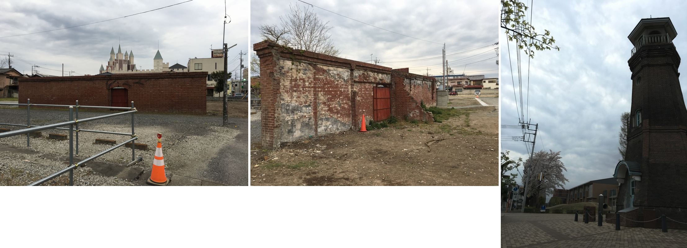 伊勢崎城があったという赤石地区を歩いてみます。 壊れかけの煉瓦塀、赤い三角コーン。 高くそびえるは<旧時報鐘楼>です。 大正五年に完成。鉄筋コンクリート煉瓦張り。 姿の美しい塔で、しばし見とれます。
