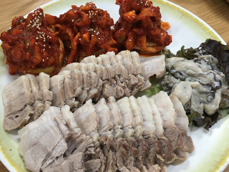 京城で大分の同業 K と合流し、K 行きつけの店に案内してもらう。 それがこれ、クルポッサム。茹でた豚肉と生の牡蠣。 気温は30度を超えており、店は勿論、路地裏の屋台に毛が生えたような場所。