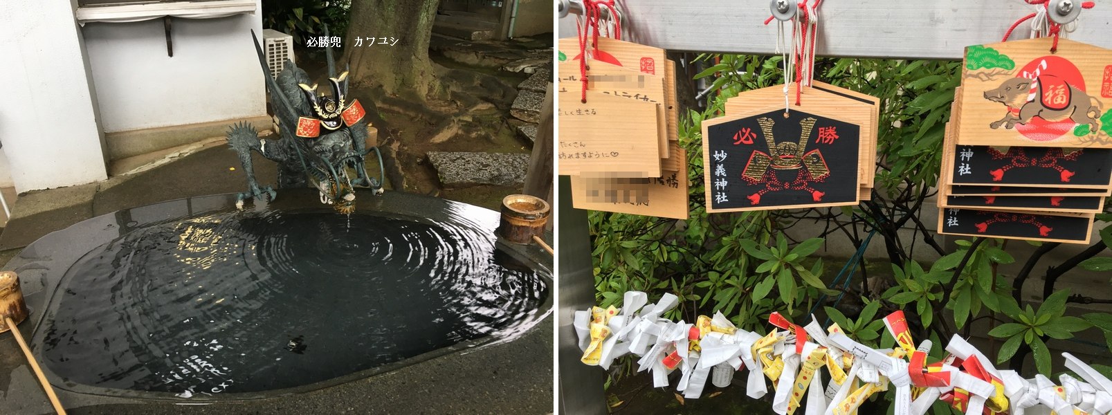 絵馬や手水の龍口にも戦勝兜! 刀剣女子も好きそうです。