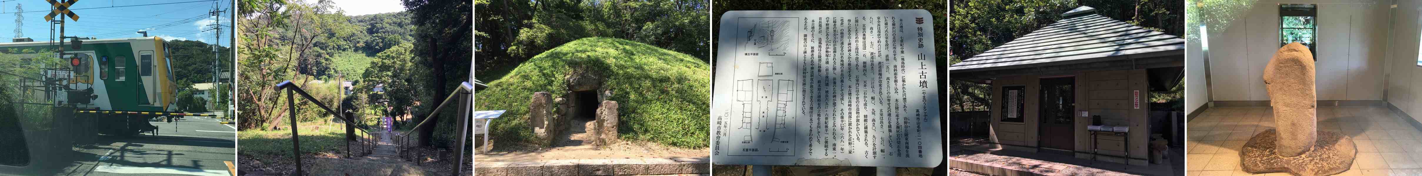 灼熱の一日、(北関東は暑いのだ) 踏切を待っていると、そこにぐんまちゃんが。 上信電鉄の「ぐんまちゃん列車」という奴らしい。 そのあとには美少女の「上州鉄道 3むすめ」というのが続いていました。 軽くムカつきながら、最初の『山上碑及び古墳』に到着。 山上碑は681年、宇治橋碑に次ぐ我が国第二の古さの年期銘を持つ石碑です。 7世紀の古墳の横に建つこの碑にたどり着くまで、結構バテました。 小高い丘ぐらいにタカをくくっていましたが、暑さもあってキツイキツイ。 早々に退却。