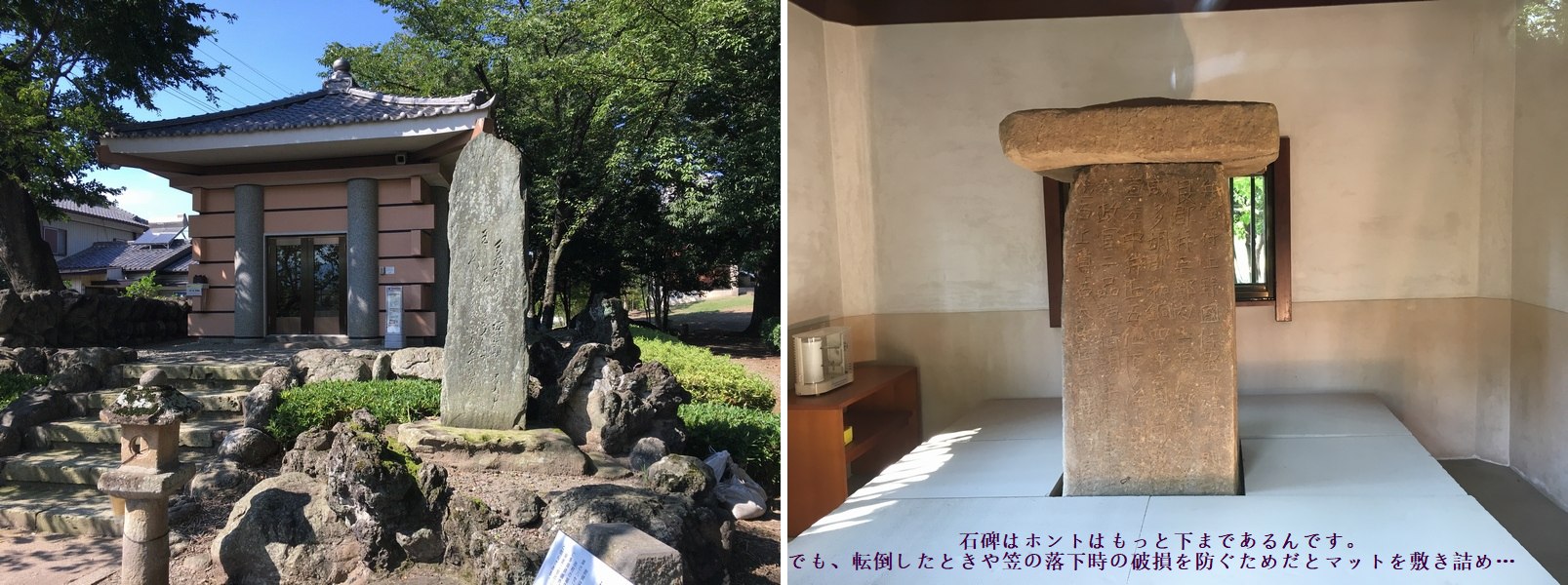 そして最後は大御所『多湖碑』 三碑のなかで一番名高い多湖碑は和銅4年、711年。 羊の碑とも呼ばれ、沢山拓本も刷られ、まぁ言ってみれば愛された碑でした。 しかしその覆堂の中は… 20年ほど前に訪れた時にはなかった、体操選手が使うようなマットが敷き詰められていて、 碑の下まで見えません。 「気持ちはわかるけれど…」と二の句が継げず、しばしボー然と眺める次第。 この風情のなさは、わざわざ見に来よう、という気を萎えさせますね、削ぎ落としますね。