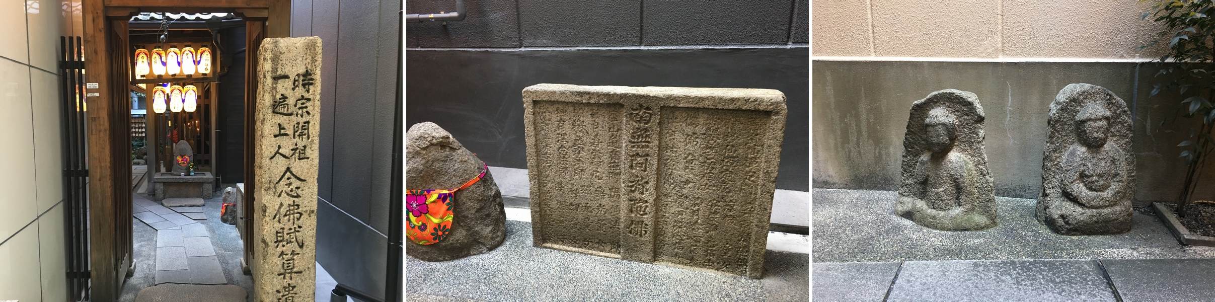 京都の新京極、アーケードを少し入ったところにある染殿院。 一遍上人が京都に入り賦算をしたという四条釈迦堂の跡地。 <一遍上人念仏賦算札遺跡>とされています。 石碑に札と同じ書体の名号。 迫力ある石仏は上人と同時代ほどのもの。