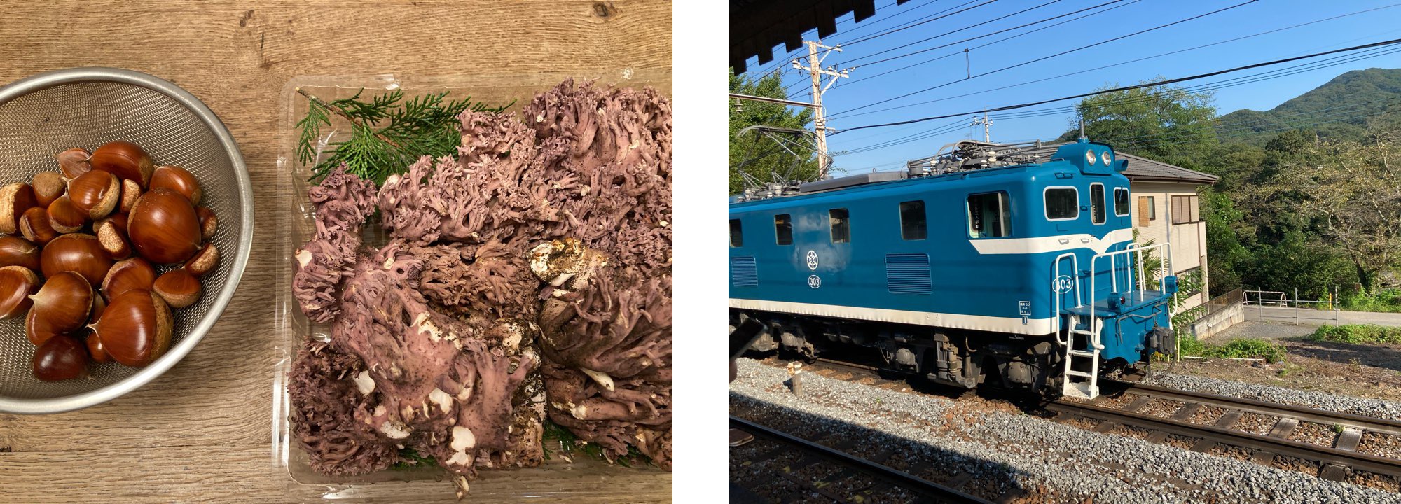 田舎道に佇む雑貨屋の軒先で「山茸あります」の手書き看板。 ネズミ茸を買ってみました。 道端におちているイガ栗と共に今日の収穫。