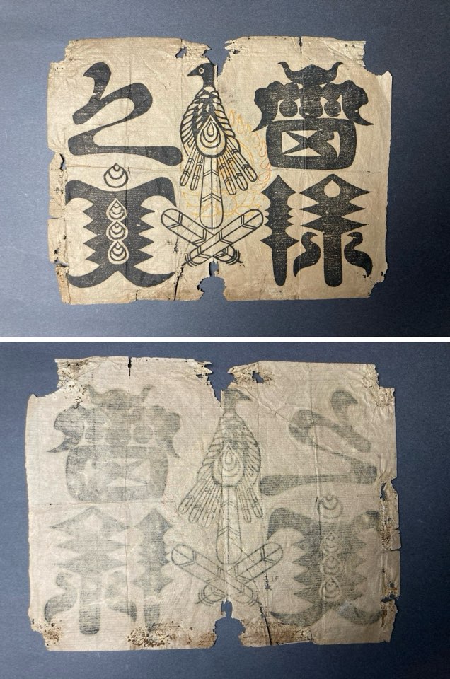 真ん中の白鷹が印の文字を表しているとすると「立山之宝印」となりますがこれは「雷◯之寶」