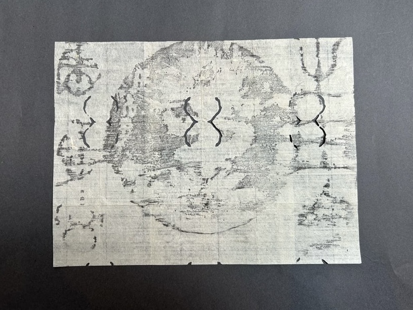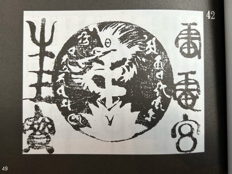 まんなかの印の字が倶利伽羅龍になっています。なかなか珍しい構図で同社が神仏習合であった時期の別当を務めていた竜蔵寺に於いて頒布をしていたと考えられます。(松場正敏氏のご指摘による『牛玉宝印〜版に表された信仰の書体〜』から)